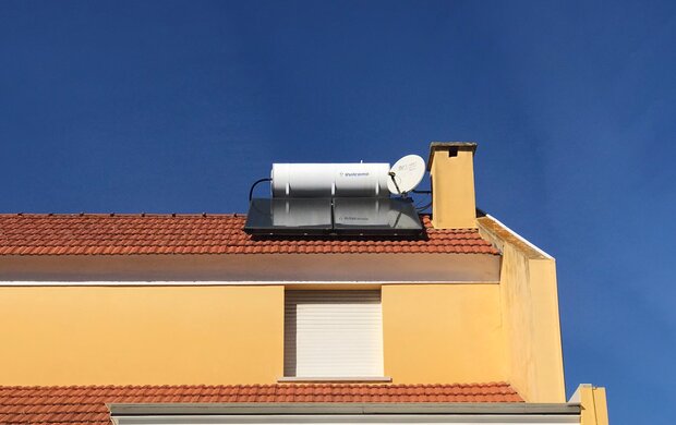 Um sistema solar térmico é constituído por um tanque e um painel solar. Neste sistema, a luz solar recolhida não é convertida em eletricidade, mas sim utilizada para aquecer água para usos sanitários (casa de banho e cozinha). Os coletores no telhado asseguram que o líquido na placa ou nos tubos é aquecido, e que é depois conduzido para um tanque de armazenamento com água. Os painéis solares térmicos não são, na sua generalidade, suficientes para produzir toda a água quente necessária (por exemplo em dias encobertos), implicando a necessidade de dispor de sistemas de apoio a gás natural, eletricidade ou biomassa. Em Portugal, esta solução permite reduzir até 70% do consumo de energia da rede no aquecimento de água, desde que o sistema esteja bem dimensionado para o perfil do agregado e mediante uma utilização correta. O tempo de recuperação do investimento de um sistema solar térmico varia entre 10 e 12 anos, dependendo da energia de apoio, tipo de instalação e fim a que se destina para um equipamento cujo tempo de vida útil é da ordem de 20 anos. Atualmente, existem sistemas solares térmicos em que o tanque pode ser colocado dentro de casa (sistemas de circulação forçada), minimizando o impacto visual no exterior do edifício tipicamente associado aos sistemas de termossifão. Mesmo assim, os coletores solares são um desafio para edifícios antigos em zonas históricas, uma vez que têm de ser instalados no telhado longe da vista. Garanta que o telhado pode suportar a carga adicional do sistema solar térmico e que este é dimensionado, instalado e mantido por um profissional.