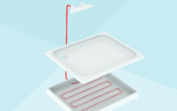 Com a recuperação de calor na drenagem do chuveiro e na base de chuveiro, a permutação de calor tem lugar no ralo do chuveiro ou diretamente por baixo da base de chuveiro. A água suja que flui para o esgoto durante o duche corre numa tubagem adjacente ao abastecimento de água fria. Como resultado, é necessária menos energia para aquecer a água do duche até alcançar a temperatura certa. A altura de uma base de chuveiro recuperadora de calor é mais elevada do que uma base de chuveiro convencional, por isso considere este fator quando decidir renovar a sua casa de banho. Esta medida permite uma redução final de 50% na utilização de energia para esta função.